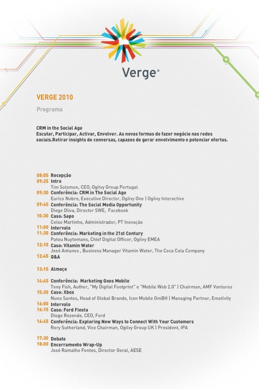 A OgilvyOne promove a 2ª edição do “Verge - The Ogilvy Digital Summit”, dia 1 de Junho, a partir das 9h00, com o tema “CRM in the Social Age”.