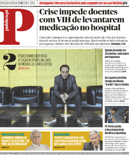 A primeira página do Público deste Domingo é mais um exemplo dessa deriva e irresponsabilidade editorial. Na Sexta (soube-se ontem), morreram, pelo menos, seis portugueses num acidente aéreo na Namíbia. Uma notícia destas teria grande destaque em qualquer primeira página de qualquer jornal do mundo se envolvesse cidadãos seus (como aliás o fizeram o Jornal de Notícias, o Diário de Notícias e o Correio da Manhã), mas o que faz o Público? Remete a notícia para uma pequena "chamada", enquanto o grande destaque vai para uma foto com Pedro Burmester e para mais uma história sobre a "crise".